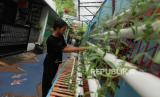 Warga merawat tanaman hidroponik di Kampung Literasi, Klender, Jakarta Timur, Kamis (13/7/2023). Kampung Literasi Klender RT 015 RW 04 tersebut menghadirkan balai yang menyediakan buku-buku yang dapat dibaca oleh warga sekitar untuk meningkatkan literasi. Selain itu Kampung Literasi tersebur juga melakukan budi daya sayuran dan ikan yang dapat dikonsumsi oleh warga sekitar secara gratis. (FOTO : Republika/Putra M. Akbar)