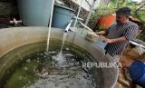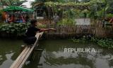 Warga memberi pakan ikan yang dibudidayakan di Kampung Literasi, Klender, Jakarta Timur, Kamis (13/7/2023). Kampung Literasi Klender RT 015 RW 04 tersebut menghadirkan balai yang menyediakan buku-buku yang dapat dibaca oleh warga sekitar untuk meningkatkan literasi. Selain itu Kampung Literasi tersebur juga melakukan budi daya sayuran dan ikan yang dapat dikonsumsi oleh warga sekitar secara gratis. (FOTO : Republika/Putra M. Akbar)