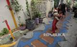 Warga berjalan menyusuri gang di Kampung Literasi, Klender, Jakarta Timur, Kamis (13/7/2023). Kampung Literasi Klender RT 015 RW 04 tersebut menghadirkan balai yang menyediakan buku-buku yang dapat dibaca oleh warga sekitar untuk meningkatkan literasi. Selain itu Kampung Literasi tersebur juga melakukan budi daya sayuran dan ikan yang dapat dikonsumsi oleh warga sekitar secara gratis. (FOTO : Republika/Putra M. Akbar)