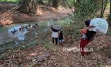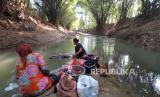 Warga menuruni bantaran kali saat akan mencuci pakaan di aliran kali Cihoe,Cibarusah, Kabupaten Bekasi, Jawa Barat, Kamis (13/7/2023). Akibat dilanda kekeringan warga yang kesulitan mendapatkan air memanfaatkan Kali Cihoe untuk mencuci baju dan mandi.Saat musim kemarau tiba, kali tersebut kerap dijadikan sumber mata air andalan warga Desa. (FOTO : Republika/ Tahta Aidilla)