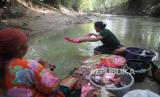 Akibat dilanda kekeringan, warga yang kesulitan mendapatkan air memanfaatkan Kali Cihoe untuk mencuci baju dan mandi.