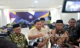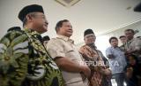 Ketua Umum PP Muhammadiyah, Haedar Nashir (tengah kiri) menerima kunjungan Menteri Pertahanan Prabowo Subianto di Kampus 4 Universitas Ahmad Dahlan, Yogyakarta, Jumat (14/7/2023). Pada pertemuan ini Prabowo dan Haedar Nashir membahas terkait solusi permasalahan bangsa serta melihat peluang kerjasama pengembangan alutsista. Usai pertemuan Menhan mengunjungi Laboratorium Nuklir milik UAD sebagai tempat penelitian rudal. (FOTO : Republika/Wihdan Hidayat)