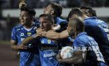 Penyerang Persib Bandung Ezra Walian bersama rekan satu tim melakukan selebrasi usai mencetak gol ke gawang Dewa United FC pada pertandingan lanjutan BRI Liga 1 di Stadion Gelora Bandung Lautan Api (GBLA), Kota Bandung, Jawa Barat, Jumat (14/7/2023). Dalam pertandingan tersebut Persib Bandung imbang melawan Dewa United FC dengan skor akhir 2-2. (FOTO : ABDAN SYAKURA/REPUBLIKA)