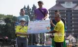 Direktur Institutional Banking BNI Muhammad Iqbal (kanan) menyerahkan hadiah kepada pemenang saat BNI UI Half Marathon 2023 di Kampus Universitas Indonesia, Depok, Jawa Barat, Ahad (16/7/2023). BNI UI Half Marathon 2023 bertema The Greenest and Most Sterile Route Half Marathon yang terbagi dari tiga kategori jarak 5K, 10K dan 21K tersebut diikuti oleh 6.000 peserta. Kegiatan tahunan yang diikuti oleh komunitas lari, atlet Ikatan Alumni Universitas Indonesia dan masyarakat Umum dari daerah Jabodetabek tersebut menyajikan pengalaman berlari di kawasan Kampus Universitas Indonesia yang dikelilingi hutan dan bebas dari kendaraan. (FOTO : Republika/Putra M. Akbar)