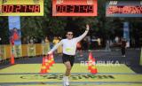 Sejumlah peserta berselebrasi setibanya di garis finish saat BNI UI Half Marathon 2023 di Kampus Universitas Indonesia, Depok, Jawa Barat, Ahad (16/7/2023). BNI UI Half Marathon 2023 bertema The Greenest and Most Sterile Route Half Marathon yang terbagi dari tiga kategori jarak 5K, 10K dan 21K tersebut diikuti oleh 6.000 peserta. Kegiatan tahunan yang diikuti oleh komunitas lari, atlet Ikatan Alumni Universitas Indonesia dan masyarakat Umum dari daerah Jabodetabek tersebut menyajikan pengalaman berlari di kawasan Kampus Universitas Indonesia yang dikelilingi hutan dan bebas dari kendaraan. (FOTO : Republika/Putra M. Akbar)