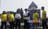 Komisaris Utama BNI Agus Dermawan Winarto Martowardojo (kelima kiri) dan Ketua Umum Iluni UI Didit Ratam (ketiga kanan) usai meresmikan dimulainya BNI UI Half Marathon 2023 di Kampus Universitas Indonesia, Depok, Jawa Barat, Ahad (16/7/2023). BNI UI Half Marathon 2023 bertema The Greenest and Most Sterile Route Half Marathon yang terbagi dari tiga kategori jarak 5K, 10K dan 21K tersebut diikuti oleh 6.000 peserta. Kegiatan tahunan yang diikuti oleh komunitas lari, atlet Ikatan Alumni Universitas Indonesia dan masyarakat Umum dari daerah Jabodetabek tersebut menyajikan pengalaman berlari di kawasan Kampus Universitas Indonesia yang dikelilingi hutan dan bebas dari kendaraan. (FOTO : Republika/Putra M. Akbar)