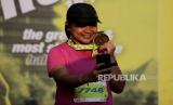Peserta berfoto dengan medali saat BNI UI Half Marathon 2023 di Kampus Universitas Indonesia, Depok, Jawa Barat, Ahad (16/7/2023). BNI UI Half Marathon 2023 bertema The Greenest and Most Sterile Route Half Marathon yang terbagi dari tiga kategori jarak 5K, 10K dan 21K tersebut diikuti oleh 6.000 peserta. Kegiatan tahunan yang diikuti oleh komunitas lari, atlet Ikatan Alumni Universitas Indonesia dan masyarakat Umum dari daerah Jabodetabek tersebut menyajikan pengalaman berlari di kawasan Kampus Universitas Indonesia yang dikelilingi hutan dan bebas dari kendaraan. (FOTO : Republika/Putra M. Akbar)