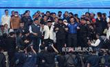 Ketua Umum Partai Nasdem Surya Paloh (tengah) berfoto bersama Bakal Calon Presiden Koalisi Perubahan untuk Persatuan (KPP) Anies Baswedan, Presiden PKS Ahmad Syaikhu, Ketua Umum Partai Demokrat Agus Harimurti Yudhoyono dan Wakil Ketua Umum Partai Nasdem Ahmad Ali (kiri-kanan) saat acara Apel Siaga Perubahan Partai Nasdem di Stadion Utama Gelora Bung Karno (SUGBK), Senayan, Jakarta, Ahad (16/7/2023). Apel siaga tersebut dilakukan dalam rangka konsolidasi kader sekaligus menguatkan Koalisi Perubahan untuk Persatuan (KPP) dalam menghadapi Pilpres 2024 mendatang. (FOTO : Republika/Thoudy Badai)