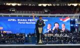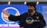 Ketua Umum Partai Nasdem Surya Paloh memberikan arahan kepada kader saat acara Apel Siaga Perubahan Partai Nasdem di Stadion Utama Gelora Bung Karno (SUGBK), Senayan, Jakarta, Ahad (16/7/2023). Apel siaga tersebut dilakukan dalam rangka konsolidasi kader sekaligus menguatkan Koalisi Perubahan untuk Persatuan (KPP) dalam menghadapi Pilpres 2024 mendatang. Acara tersebut dihadiri oleh Bakal Calon Presiden Koalisi Perubahan untuk Persatuan (KPP) Anies Baswedan dan petinggi partai koalisi lainnya yakni Ketua Umum Partai Demokrat Agus Harimurti Yudhoyono dan Presiden PKS Ahmad Syaikhu bersama jajarannya. (FOTO : Republika/Thoudy Badai)