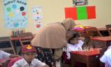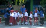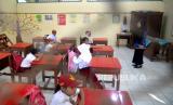 Murid baru memasuki kelas pada hari pertama sekolah di SDN Nayu Barat 1, Surakarta, Jawa Tengah, Senin (17/7/2023). Pada tahun ajaran baru 2023/2024 ini SDN Nayu Barat 1 menerima 9 murid baru dan siswa dari jalur zonasi hanya 1. Sementara itu, di Surakarta ada sekitar 13 SD yang siswanya kurang dari 10 orang. Penyebabnya karena tidak ada anak usia sekolah di sekitar sekolah tersebut. (FOTO : Republika/Wihdan Hidayat)