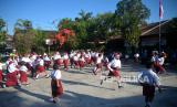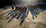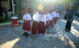 Siswa berlarian menuju kelas usai mengikuti upacara pada hari pertama sekolah di SDN Nayu Barat 1, Surakarta, Jawa Tengah, Senin (17/7/2023). Pada tahun ajaran baru 2023/2024 ini SDN Nayu Barat 1 menerima 9 murid baru dan siswa dari jalur zonasi hanya 1. Sementara itu, di Surakarta ada sekitar 13 SD yang siswanya kurang dari 10 orang. Penyebabnya karena tidak ada anak usia sekolah di sekitar sekolah tersebut. (FOTO : Republika/Wihdan Hidayat)