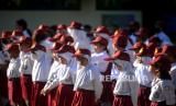 Siswa mengikuti upacara pada hari pertama sekolah di SDN Nayu Barat 1, Surakarta, Jawa Tengah, Senin (17/7/2023). Pada tahun ajaran baru 2023/2024 ini SDN Nayu Barat 1 menerima 9 murid baru dan siswa dari jalur zonasi hanya 1. Sementara itu, di Surakarta ada sekitar 13 SD yang siswanya kurang dari 10 orang. Penyebabnya karena tidak ada anak usia sekolah di sekitar sekolah tersebut. (FOTO : Republika/Wihdan Hidayat)