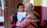 Seorang siswa memeluk orang tuanya saat hari pertama masuk sekolah di SD Negeri Anyelir 1 Depok , Jawa Barat, senin (17/7/2023). Hari pertama masuk sekolah tahun ajaran 2023/2024 itu diawali dengan pelaksanaan Masa Pengenalan Lingkungan Sekolah (MPLS). Di Sekolah tersebut MPLS untuk Kelas 1 dilakukan selama 2 minggu dan untuk kelas 2 hingga kelas 6 dilakukan selama 3 hari. Kegiatan MPLS dibuat semenarik mungkin dan menyenangkan sehingga siswa diharapkan bersemangat untuk belajar setelah mengenali dan memahami lingkungan belajarnya. (FOTO : Republika/Prayogi)