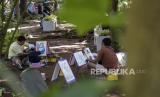 Sejumlah anak didampingi orang tua melukis di kawasan Taman Lansia, Jalan Cisangkuy, Kota Bandung, Jawa Barat, Rabu (19/7/2023). Taman yang menawarkan pemandangan dan sensasi hutan di tengah kota tersebut menjadi destinasi wisata alternatif yang ramai dikunjungi masyarakat saat libur tahun baru Islam 1445 H. (FOTO : ABDAN SYAKURA/REPUBLIKA)