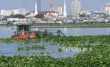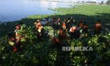 REPUBLIKA.CO.ID,JAKARTA -- Petugas Unit Penanganan Sampah Badan Air Dinas Lingkungan Hidup DKI Jakarta membersihkan eceng gondok di Waduk Pluit, Jakarta Utara, Rabu (19/7/2023).
