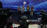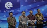 Menteri Komunikasi dan Informatika (Kominfo) Budi Arie Setiadi (kedua kiri) bersama Staf Ahli Kominfo Bidang Komunikasi dan Media Massa Widodo Muktiyo, Dirjen Informasi dan Komunikasi Publik Kominfo Usman Kansong dan Direktorat Jenderal (Dirjen) Aplikasi Informatika Kominfo Semuel Pangerapan (dari kiri ke kanan) menyampaikan konferensi pers terkait judi online di Gedung Kominfo, Jakarta, Kamis (20/7/2023). Kemenkominfo mencatat sejak 2018 hingga 19 Juli 2023 telah melakukan pemutusan akses terhadap 846.047 konten perjudian online. (FOTO : Republika/Putra M. Akbar)