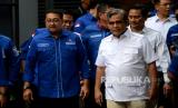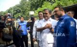 Sekjen Partai Demokrat Teuku Riefky Harsya bersama Sekjen Partai Gerindra Ahmad Muzani berjalan untuk melakukan pertemuan di Kantor DPP Partai Demokrat, Jakarta, Kamis (20/7/2023). Pertemuan silahturahmi kebangsaan ini membahas isu-isu kebangsaan dan menjalin komunikasi untuk menjaga stabilitas politik nasional jelang pemilu 2024. (FOTO : Republika/Prayogi)