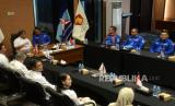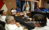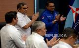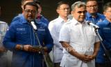 Sekjen Partai Demokrat Teuku Riefky Harsya bersama Sekjen Partai Gerindra Ahmad Muzani serta jajaran elite kedua partai saat melakukan pertemuan di Kantor DPP Partai Demokrat, Jakarta, Kamis (20/7/2023). Pertemuan silahturahmi kebangsaan ini membahas isu-isu kebangsaan serta menjalin komunikasi untuk menjaga stabilitas politik nasional jelang pemilu 2024. (FOTO : Republika/Prayogi)