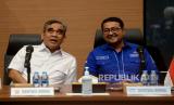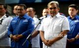 Sekjen Partai Demokrat Teuku Riefky Harsya bersama Sekjen Partai Gerindra Ahmad Muzani bersiap memberikan keterangan usai melakukan pertemuan di Kantor DPP Partai Demokrat, Jakarta, Kamis (20/7/2023). Pertemuan silahturahmi kebangsaan ini membahas isu-isu kebangsaan sekaligus menjalin komunikasi untuk menjaga stabilitas politik nasional jelang pemilu 2024. (FOTO : Republika/Prayogi)