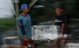 Pekerja mengangkat bantalan getah karet di lapak karet Mesuji, Ogan Komering Ilir, Sumatera Selatan, Kamis (20/7/2023). Pengepul mengaku banyaknya lahan karet yang beralih fungsi menjadi lahan sawit di daerah tersebut mengakibatkan pasokan getah karet dari petani sejak tiga tahun terakhir terus menurun dari biasanya menampung hingga 30 ton getah karet per minggu saat ini menjadi 10 ton per minggu. (FOTO : Antara/Budi Candra Setya)