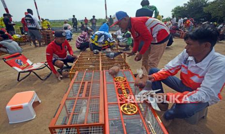 Puluhan anggota komunitas pecinta burung memilih merpati saat mengikuti lomba ketepatan mendarat burung merpati di Lapangan Unyur, Serang, Banten, Jumat (21/7/2023). Lomba yang diikuti ratusan peserta dari berbagai daerah di Indonesia itu digelar dalam rangka peringatan HUT Polri ke-77. (FOTO : ANTARA FOTO/Asep Fathulrahman)