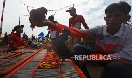 REPUBLIKA.CO.ID, BANTEN -- Puluhan anggota komunitas pencinta burung mengikuti lomba ketepatan mendarat burung merpati di Lapangan Unyur, Serang, Banten, Jumat (21/7/2023).