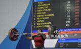 Lifter asal Jawa Tengah, Anis Nur Romadoni bertanding pada Kejuaraan Nasional Angkat Besi Senior 2023 di GOR Saparua, Kota Bandung, Jawa Barat, Jumat (21/7/2023). Kejuaraan nasional yang digelar oleh Perkumpulan Angkat Besi Seluruh Indonesia (PABSI) tersebut diikuti oleh 280 atlet dari 13 provinsi di Indonesia. Kejuaraan tersebut digelar dalam rangka persiapan atlet untuk menghadapi PON XXI/2024 yang akan digelar di Sumatera Selatan dan Aceh. (FOTO : ABDAN SYAKURA/REPUBLIKA)