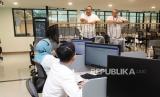 Direktur Utama Bank Mega Syariah (BMS) Yuwono Waluyo (kedua kanan) bersama Direktur Operasi & Transformasi Bank Mega Syariah Slamet Riyadi (kanan) saat berkunjung ke layanan contact center yang baru diresmikan di Jakarta, Jumat (21/7/2023). Layanan Contact Center BMS ini nantinya tidak hanya melayani kebutuhan informasi atau keluhan nasabah, namun juga mengintegrasikan aktivitas outbound call nasabah seperti telemarketing untuk tabungan haji, pembiayaan konsumer, kartu pembiayaan Syariah Card hingga penyediaan layanan wealth management. (FOTO : Dok Republika)