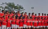 Ketua Umum PSSI Erick Thohir (tengah) berfoto bersama pemain yang mengikuti seleksi tim U-17 di Persija Training Ground, Bojongsari, Sabtu (22/7/2023). (FOTO : Republika/Afrizal Rosikhul Ilmi)