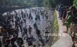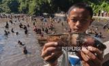 REPUBLIKA.CO.ID,KLATEN -- Seorang anak menunjukan ikan hasil tangkapan saat tradisi Bukak Teteg Cueran di Demakijo, Karangnongko, Klaten, Jawa Tengah, Sabtu (22/7/2023).
