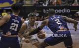 Pebasket Prawira Harum Bandung Muhammad Fhirdan Guntara (tengah) berusaha melewati hadangan pebasket Pelita Jaya Bakrie Jakarta pada babak final Indonesia Basket League (IBL) Tokopedia 2023 di Gor C-Tra Arena Bandung, Kota Bandung, Jawa Barat, Sabtu (22/7/2023). Prawira Harum Bandung berhasil menjadi juara IBL Tokopedia 2023 usai mengalahkan Pelita Jaya Bakrie Jakarta dengan skor 63-58. (FOTO : ABDAN SYAKURA/REPUBLIKA)