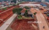 REPUBLIKA.CO.ID,DEPOK -- Foto udara rumah yang belum digusur pada proyek Jalan Tol Cijago seksi 3B yang menghubungkan wilayah Serpong,Cinere, dan Tol Jagorawi di Limo, Depok, Jawa Barat, Senin (24/7/2023).
