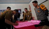 Kapolresta Jambi Kombes Pol Eko Wahyudi (kanan) menyaksikan penandatanganan kesepakatan penolakan peredaran narkoba di ruang pertemuan kawasan lokalisasi Payo Sigadung, Rawasari, Jambi, Selasa (25/7/2023). Puluhan ibu-ibu yang turut menggerebek tempat diduga lokasi pesta narkoba di lokalisasi pada Sabtu (22/7/2023) yang kemudian viral di media sosial itu mulai mengkhawatirkan keselamatan diri mereka karena mendapat intimidasi dari diduga pelaku penyewa tempat yang saat ini masih bebas. (FOTO : Antara/Wahdi Septiawan )