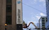 Seorang pekerja mencopot logo di gedung pusat Twitter di San Francisco, Selasa, (24/7/2023)WIB. (FOTO : AP Photo/Godofredo A. Vásquez)