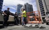 Polisi berbicara dengan seorang pekerja setelah pencopotan logo di gedung pusat Twitter dihentikan di San Francisco, Selasa, (24/7/2023)WIB. (FOTO : AP Photo/Godofredo A. Vásquez)