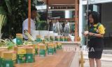 Pengunjung mengambil minum saat peluncuran OBH Combi Herbal di Jakarta, Selasa (25/7/2023). (FOTO : Republika/ Tahta Aidilla)