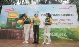 Senior General Manager Marketing Consumer Health Combipar Cindy Gunawan beriikan paparan saat peluncuran OBH Combi Herbal di Jakarta, Selasa (25/7/2023). (FOTO : Republika/ Tahta Aidilla)