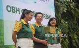 Publik Figur Sharena Delon, Senior Vice President Marketing & International Operations Combipar Weitarsa Hendarto dan Senior General Manager Marketing Consumer Health Combipar Cindy Gunawan (dari kiri) berbincang saat peluncuran OBH Combi Herbal di Jakarta, Selasa (25/7/2023). (FOTO : Republika/ Tahta Aidilla)