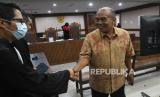 Terdakwa Budi Tjahjono (kanan) menjabat tangan salah satu jaksa penuntut dari KPK usai sidang putusan kasus gratifikasi sebesar 2,091 juta dolar AS di Pengadilan Tipikor, Jakarta, Kamis (27/7/2023). Majelis hakim memvonis Budi yang merupakan mantan Dirut PT Asuransi Jasindo tersebut dengan lima tahun kurungan penjara dan denda Rp1 miliar subsider kurungan selama empat bulan serta harus membayar uang pengganti sebesar Rp27,688 miliar dalam waktu sebulan ke depan. ANTARA FOTO/Aditya Pradana Putra/foc. (FOTO : ANTARA FOTO/Aditya Pradana Putra)