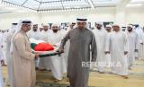 REPUBLIKA.CO.ID, ABU DHABI -- Presiden Uni Emirat Arab dan pejabat pemerintahan emirat Abu Dhabi menghadiri sholat bersama saat upacara pemakaman saudaranya, Sheikh Saeed bin Zayed Al Nahyan, di Masjid Pertama Sheikh Sultan bin Zayed di Abu Dhabi, Uni Emirat Arab, Kamis (27/7/2023).