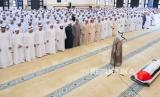 Presiden Uni Emirat Arab dan pejabat pemerintahan emirat Abu Dhabi, menghadiri sholat bersama saat upacara pemakaman saudaranya Sheikh Saeed bin Zayed Al Nahyan, di Masjid Pertama Sheikh Sultan bin Zayed di Abu Dhabi, Uni Emirat Arab, (27/7/2023). (FOTO : EPA-EFE/THE UAE PRESIDENTIAL COURT)