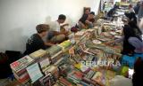 Pengunjung memilih buku bacaan lama saat Pasar Kangen 2023 di Taman Budaya Yogyakarta, Jumat (28/7/2023). Pasar Kangen ini merupakan agenda tahunan yang dimulai sejak 2007 silam. Berbagai lapak kuliner tradisional dan barang-barang tempo dulu digelar hingga 5 Agustus mendatang. Selain sebagai ajang nostalgia pengunjung, acara ini juga untuk membantu UMKM setempat. (FOTO : Republika/Wihdan Hidayat)