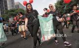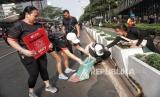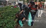 Karyawan Bank DBS Indonesia melakukan kegiatan mengumpulkan sampah Pada momen Car Free Day (CFD), Senayan, Jakarta, Ahad (30/7/2023). Kegiatan ini merupakan bagian dari perayaan HUT Bank DBS Indonesia yang ke-34. Dengan melibatkan karyawan Bank DBS Indonesia dan berkolaborasi dengan Operasi Semut, aksi ini berhasil mengumpulkan 83 kg sampah dalam waktu kurang dari satu jam. Bank DBS Indonesia memperkuat komitmen akan keberlanjutan serta pengembangan lingkungan kerja yang inklusif (FOTO : Republika/Prayogi)