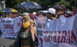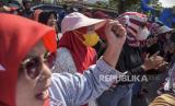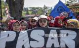 Pedagang Pasar Banjaran melakukan aksi di depan Gedung Sate, Jalan Diponegoro, Kota Bandung, Jawa Barat, Senin (31/7/2023). Dalam aksi tersebut mereka meminta untuk menghentikan sementara seluruh kegiatan revitalisasi Pasar Rakyat Banjaran sampai dengan adanya putusan yang berkekuatan hukum, serta meminta pengelolaan pasar tetap oleh pemerintah. (FOTO : ABDAN SYAKURA/REPUBLIKA)
