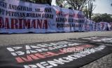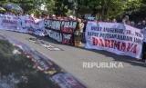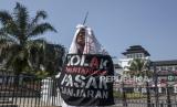 Aktivis melakukan aksi di depan Gedung Sate, Jalan Diponegoro, Kota Bandung, Jawa Barat, Senin (31/7/2023). Dalam aksi tersebut mereka meminta untuk menghentikan sementara seluruh kegiatan revitalisasi Pasar Rakyat Banjaran sampai dengan adanya putusan yang berkekuatan hukum, serta meminta pengelolaan pasar tetap oleh pemerintah. (FOTO : ABDAN SYAKURA/REPUBLIKA)