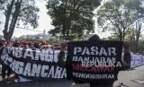 REPUBLIKA.CO.ID, BANDUNG -- Sejumlah pedagang Pasar Banjaran bersama aktivis melakukan aksi di depan Gedung Sate, Jalan Diponegoro, Kota Bandung, Jawa Barat, Senin (31/7/2023).