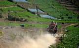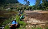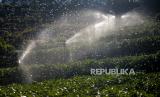 Petani menyiram kebun kentang dengan air dari Telaga Merdada di Batur, Banjarnegara, Jawa Tengah, Senin (31/7/2023). Air Telaga Merdada menjadi sumber utama bagi petani untuk pengairan selama musim kemarau. Penduduk di sekitar Telaga Merdada mayoritas petani kentang. Deretan pompa diesel penyedot air berderet berada di tepian telaga. Setiap hari petani harus mengeluarkan sekitar lima liter bahan bakar minyak untuk menyedot air. (FOTO : Republika/Wihdan Hidayat)