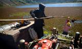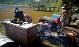 Petani memantau pompa diesel untuk menyedot air di Telaga Merdada, Batur, Banjarnegara, Jawa Tengah, Senin (31/7/2023). Air Telaga Merdada menjadi sumber utama bagi petani untuk pengairan selama musim kemarau. Penduduk di sekitar Telaga Merdada mayoritas petani kentang. Deretan pompa diesel penyedot air berderet berada di tepian telaga. Setiap hari petani harus mengeluarkan sekitar lima liter bahan bakar minyak untuk menyedot air. (FOTO : Republika/Wihdan Hidayat)
