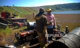 Petani memperbaiki pipa untuk menyedot air di Telaga Merdada, Batur, Banjarnegara, Jawa Tengah, Senin (31/7/2023). Air Telaga Merdada menjadi sumber utama bagi petani untuk pengairan selama musim kemarau. Penduduk di sekitar Telaga Merdada mayoritas petani kentang. Deretan pompa diesel penyedot air berderet berada di tepian telaga. Setiap hari petani harus mengeluarkan sekitar lima liter bahan bakar minyak untuk menyedot air. (FOTO : Republika/Wihdan Hidayat)