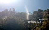 Air dari Telaga Merdada untuk menyemprot tanaman kentang di Batur, Banjarnegara, Jawa Tengah, Senin (31/7/2023). Air Telaga Merdada menjadi sumber utama bagi petani untuk pengairan selama musim kemarau. Penduduk di sekitar Telaga Merdada mayoritas petani kentang. Deretan pompa diesel penyedot air berderet berada di tepian telaga. Setiap hari petani harus mengeluarkan sekitar lima liter bahan bakar minyak untuk menyedot air. (FOTO : Republika/Wihdan Hidayat)